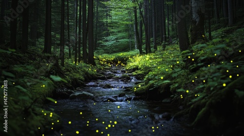 Obraz premium Magical Firefly Lit Forest Stream at Night