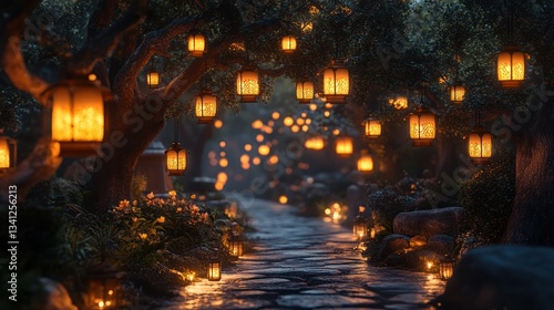© arlisa, Obraz premium Magical Floating Lanterns Pathway at Night