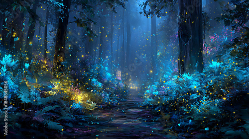 © Rakib, Fototapeta premium Magical Forest at Night with Fireflies and Blue Glow