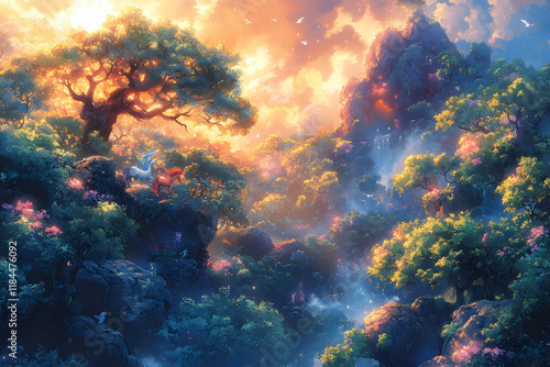 © AgungRikhi, Fototapeta premium Magical Forest at Sunset with Glowing Trees and Animals