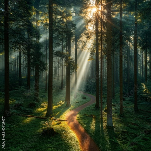 © Kenny, Obraz premium Magical forest clearing with rays of sunlight breaking through the trees
