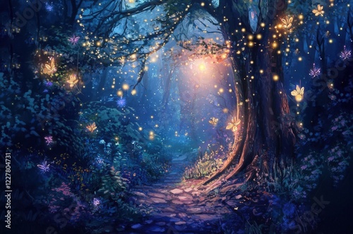 © Nadezhda, Naklejka premium Magical Forest Illustration with Glowing Butterflies at Night in Blue and Purple