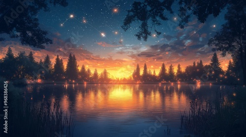 © TatChong, Naklejka premium Magical Forest Lake at Sunset