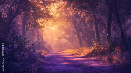 Fototapeta premium Magical forest path bathed in warm golden light with a purple haze and a...