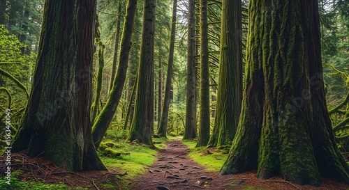 Obraz premium Magical Forest Path Through Towering Trees Covered in Moss, Tranquil Walkway...