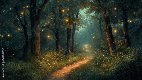 Obraz premium Magical Forest Path with Glowing Fireflies at Dusk.