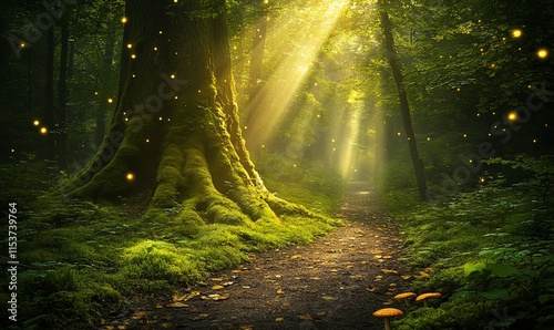 © alisya, Fototapeta premium Magical forest path with sunbeams, moss, and fireflies.