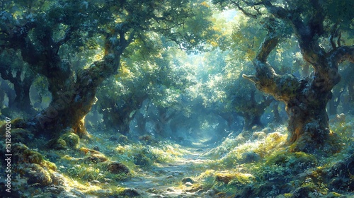 Fototapeta premium Magical Forest Path with Sunlit Trees, and Nature Scene.