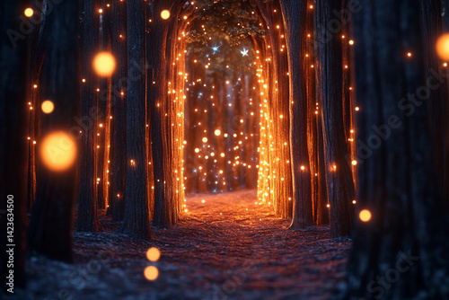 © Olegarx525, Obraz premium Magical forest pathway illuminated by glowing lights at twilight