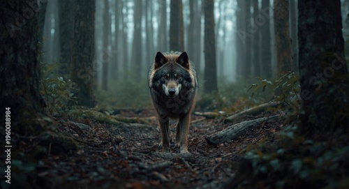 © vxnaghiyev, Fototapeta premium Magical forest scene with a noble werewolf sentinel