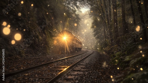 Obraz premium Magical forest train journey, light beams, misty valley, travel poster