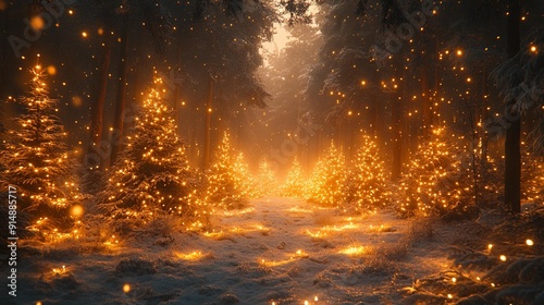 Naklejka premium Magical forest with Christmas trees and glowing lights, ideal for festive and...