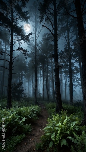 © claudunia, Fototapeta premium Magical forest with fog and moonlight.