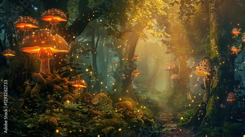 Obraz premium Magical Forest with Glowing Mushrooms and Fairy Lights at Twilight