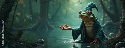 Obraz premium Magical frog wizard contemplatively gesturing against misty forest backdrop