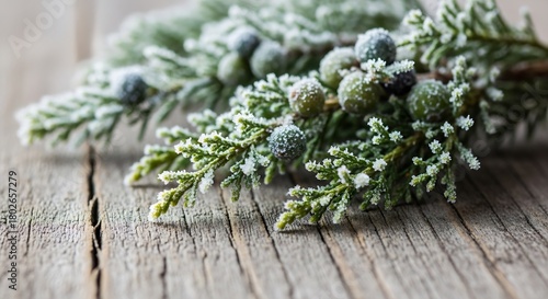Obraz premium Magical frosted juniper branch with berries on rustic wood, perfect for winter holiday designs and festive seasonal projects, create a cozy atmosphere