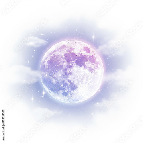 © ma--photo, Fototapeta premium Magical full moon glowing in pastel purple, pink, and blue night sky — dreamy atmosphere with glittering stars and soft clouds copy