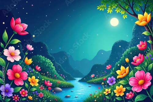 © Phennapha, Obraz premium Magical garden doodles banner featuring fantastical flowers and sparkling water, decoration, magical flowers