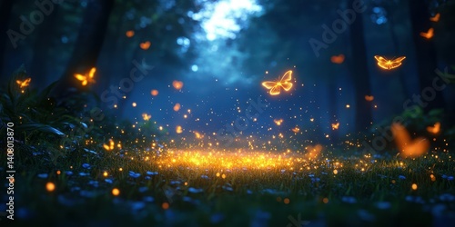 © Georg, Naklejka premium Magical glowing butterflies illuminate a serene forest at twilight, creating an enchanting atmosphere for visitors to enjoy