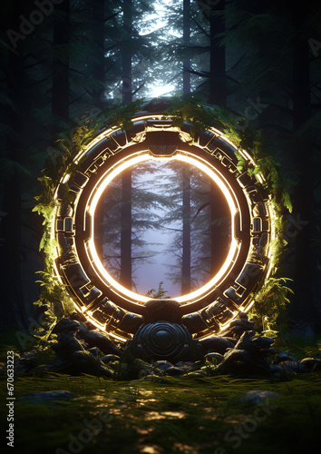 Obraz premium magical glowing portal in the middle of a dense forest, generative ai