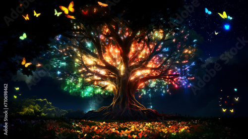 © Kondor83, Naklejka premium Magical glowing tree with fireflies