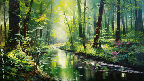 © Mukhlesur, Obraz premium Magical Green Forest Sunlight Filtering Through Vibrant Foliage
