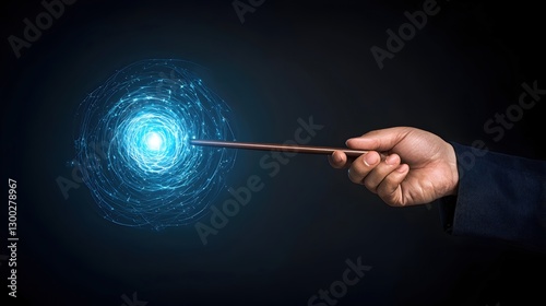 © Teerapat, Fototapeta premium Magical Hand with Wand Creating Light in Dark Background
