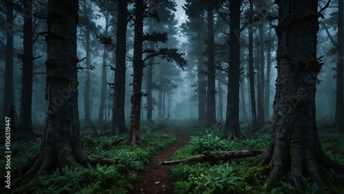 © claudunia, Fototapeta premium Magical hidden ancient forest with fog and moonlight.
