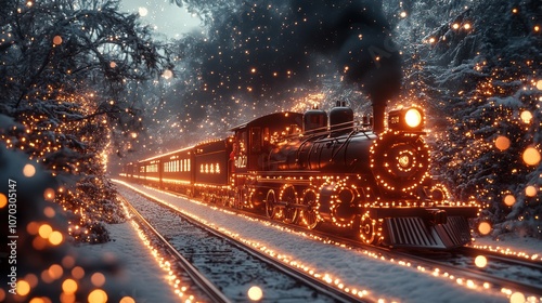 Naklejka premium Magical holiday train adorned with twinkling lights travels through a snowy...