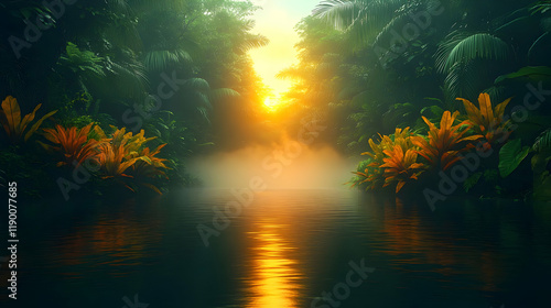 Fototapeta premium Magical Jungle River at Sunset with Misty Atmosphere