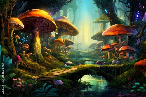 Fototapeta premium Magical landscape showing giant toadstools and a winding stream under a light beam