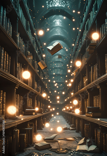 © Jakkrit, Obraz premium Magical Library with Floating Books and Glowing Orbs Generative AI