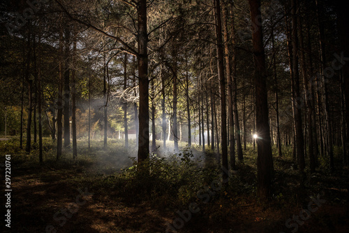 © zef art, Naklejka premium Magical lights sparkling in mysterious pine forest at night.