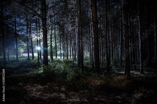 © zef art, Obraz premium Magical lights sparkling in mysterious pine forest at night.