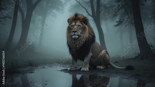 © VirtualVista, Naklejka premium magical lion in a foggy woods