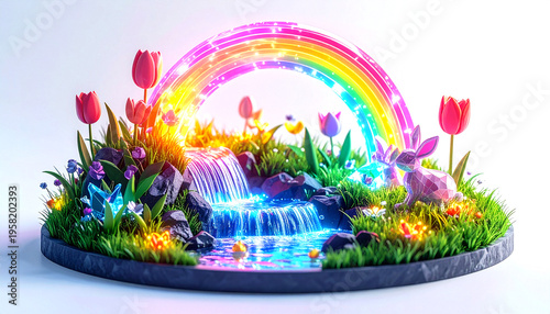 Fototapeta premium Magical miniature landscape with glowing rainbow and low-poly rabbit