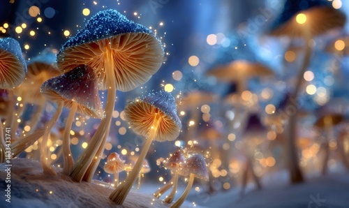 Naklejka premium Magical mushrooms illuminating a dreamy forest floor with sparkling dust, creating an enchanting winter wonderland ambiance and festive spirit