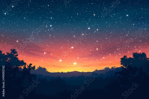 Naklejka premium Magical Night Sky. Vibrant Starry Landscape with a Tranquil Twilight Horizon