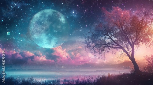Obraz premium Magical Night Sky with Full Moon and Tree Silhouette.