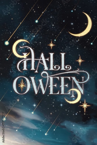 Naklejka premium Magical night sky with 'Halloween' text and celestial elements.