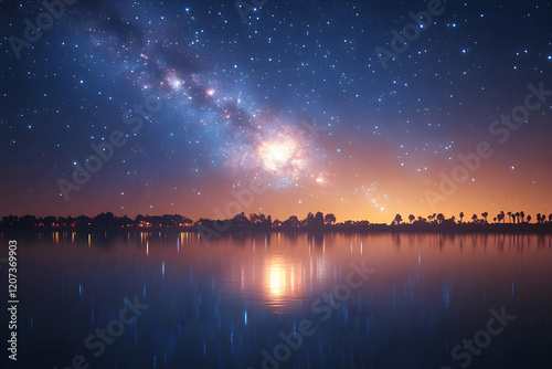 © AgungRikhi, Fototapeta premium Magical Nightscape: City Lights Reflected in a Tranquil Lake Under a Starry Sky