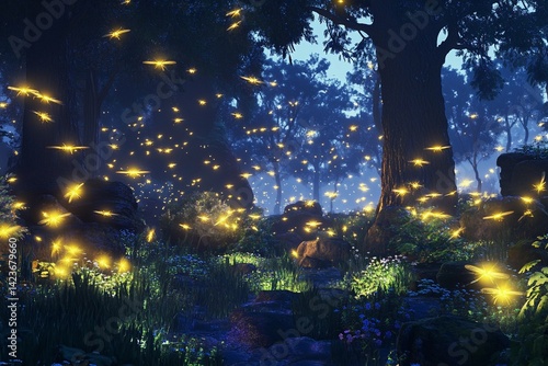 Naklejka premium Magical nighttime forest illuminated by glowing fireflies dancing amidst trees and flowers