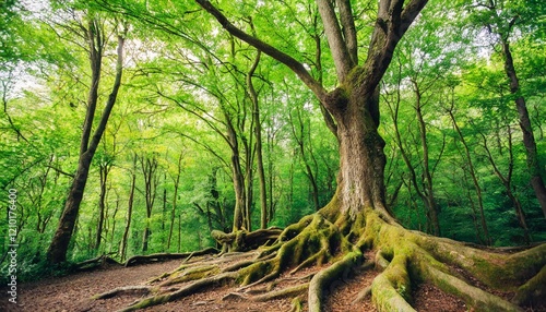 © Artbi, Fototapeta premium Magical Old Tree with Twisted Roots and Lush Green Foliage in Enchanted Forest