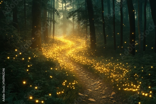 © EdvvinStudios, Naklejka premium Magical pathway illuminated by fireflies deep in a serene forest during twilight