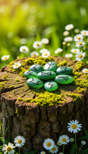 © Aronova, Fototapeta premium Magical runes on mossy stump surrounded by daisies. For instagram stories