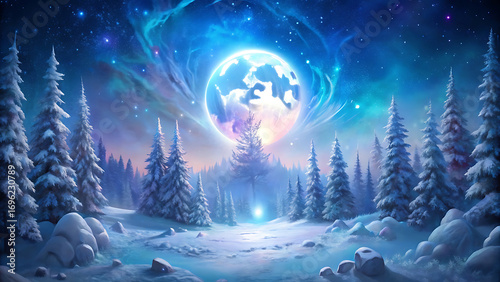© Rubina, Fototapeta premium Magical snowy background with glowing moon pine forest vector illustration on white background