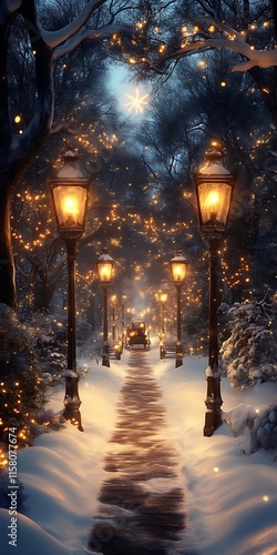 © Babang, Obraz premium Magical snowy path with glowing lights.