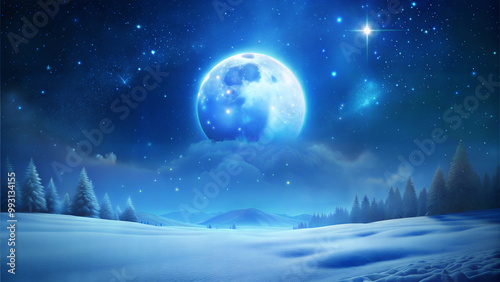 Fototapeta premium Magical starry winter sky with a full moon illuminating snowy landscape