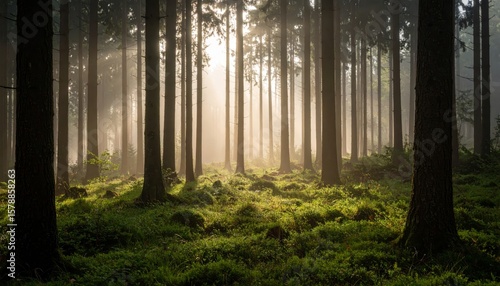 © admin_design, Naklejka premium Magical sunbeam piercing through a mystical forest canopy, breathtaking nature scene