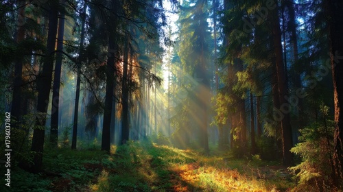 Fototapeta premium Magical Sunlight Filtering Through Tall Trees in a Misty Forest Creating a...